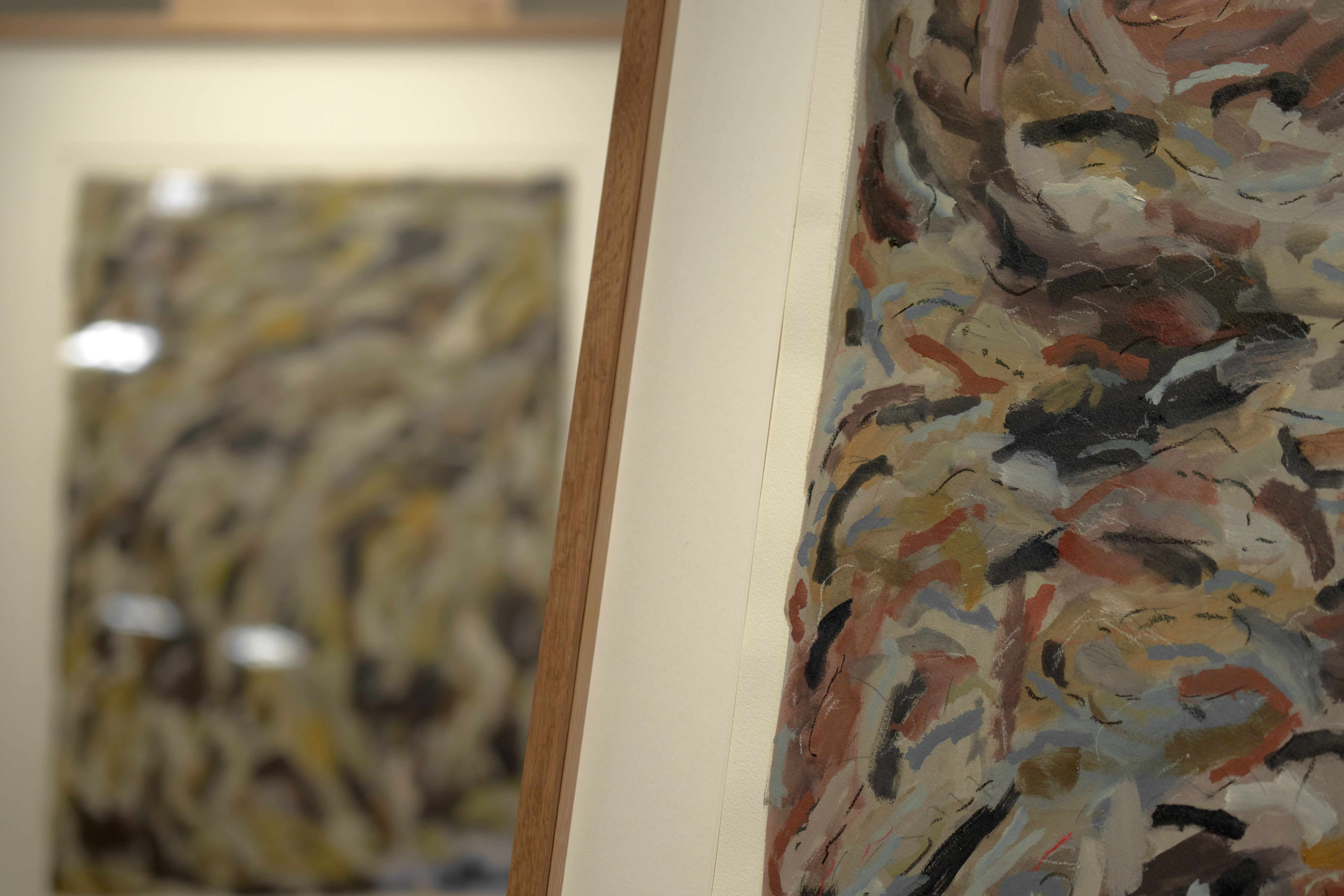 through formal interplay, unified in compositional harmony through stitches of charcoal and pastel.