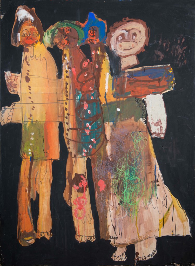 Acrylic, crayon, marker on paper-pasted cotton canvas